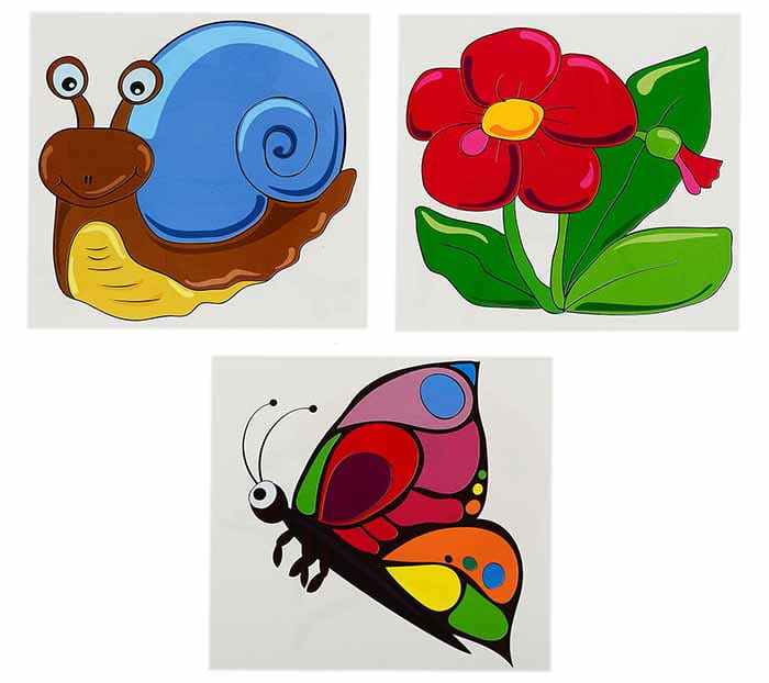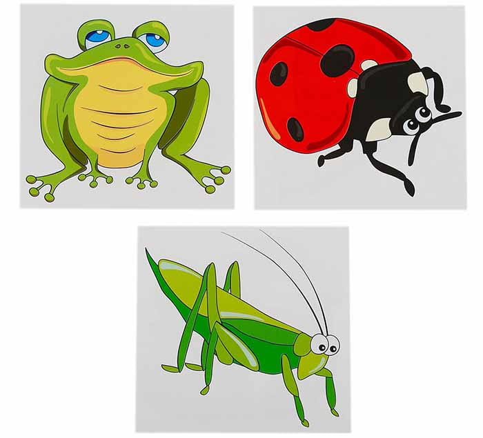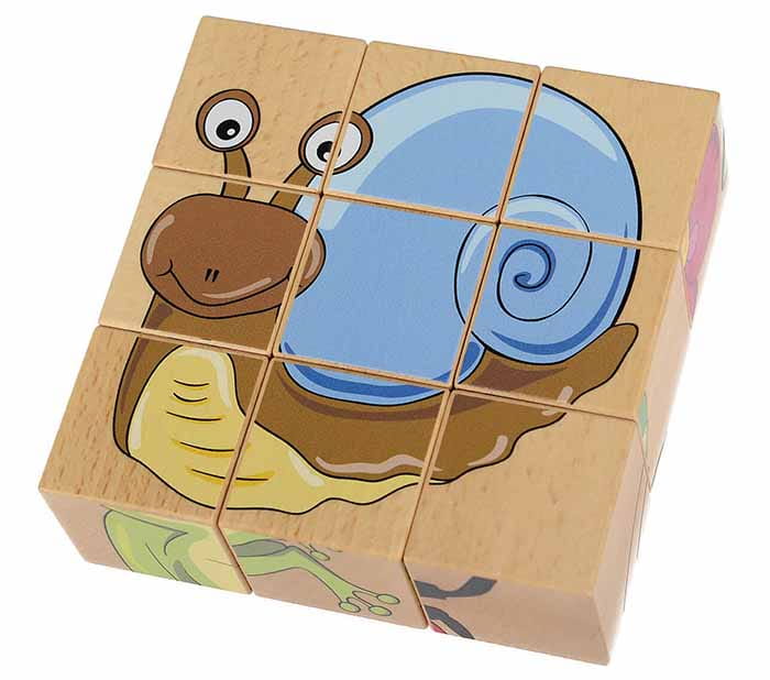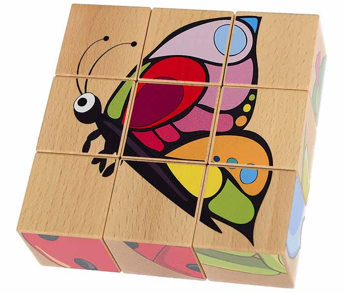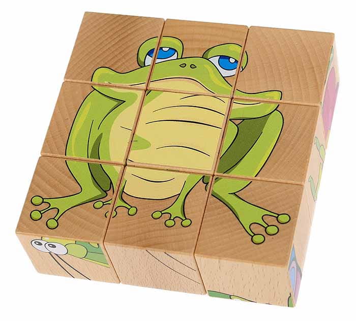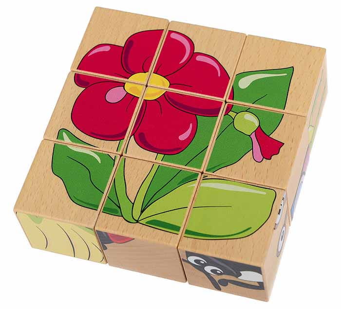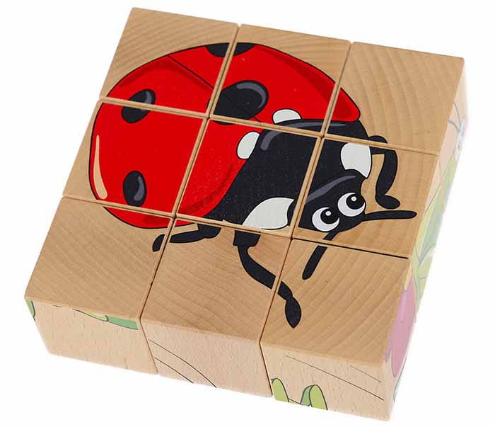 W zestawie 9 klocków w kształcie sześcianów. Na każdej stronie znajduje się element innego obrazka przedstawiającego zwierzę lub roślinkę z łąki, m.in. konika polnego, motyla, żaby, biedronki, ślimaka.