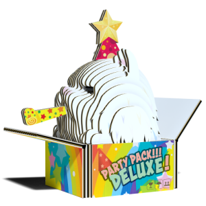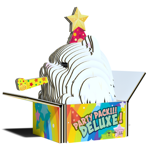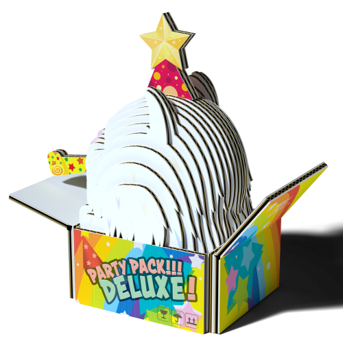 Kotek Eugy ma urodzinową czapeczkę, a w pyszczku trąbkę, ponieważ jest to bardzo imprezowy kotek. Kotek siedzi w kolorowym pudełku po dekoracjach imprezowych, może to właśnie z tego pudełka kotek wygrzebał czapeczkę i trąbkę.
