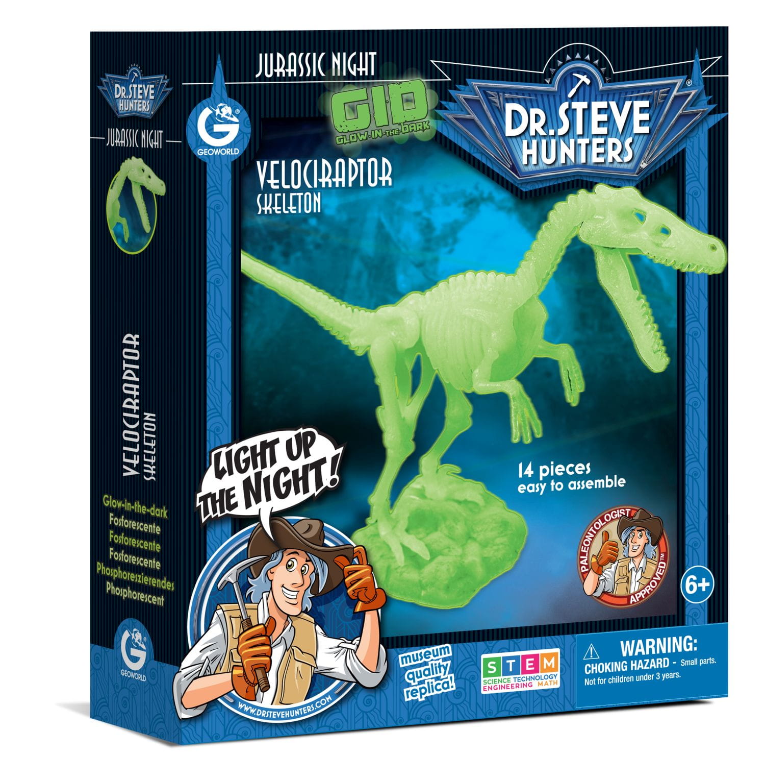 Szkielet dinozaura VELOCIRAPTOR do samodzielnego złożenia. Model GEO1652 od Geoworld to replika prehistorycznego gada velociraptora, który świeci w ciemności. Model składa się z 14 elementów, do zestawu dołączona jest instrukcja graficzna. Figurkę można postawić na specjalnej podstawce z nazwą dinozaura (w komplecie), a później przeczytać informacje o nim z dołączonej broszurki.