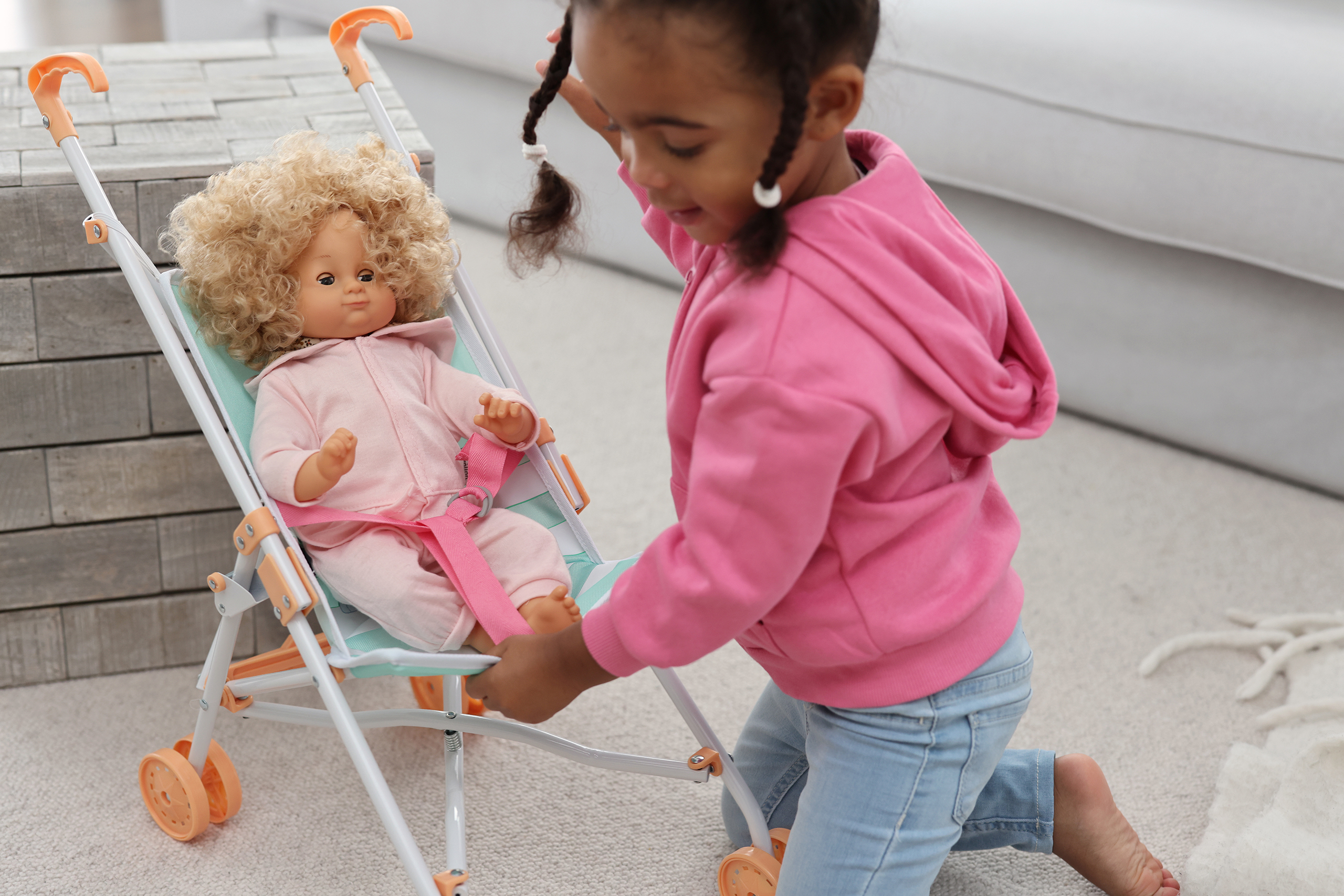Urocza spacerówka dla lalek została zaprojektowana w Szwecji i starannie wykonana z motywem Bluey na podstawie oryginalnych postaci z kreskówki o tym samym tytule. Pasuje do lalek o wysokości do 45 cm, ma zdejmowaną tapicerkę i pasy bezpieczeństwa, dzięki czemu można łatwo ją utrzymać w czystości.