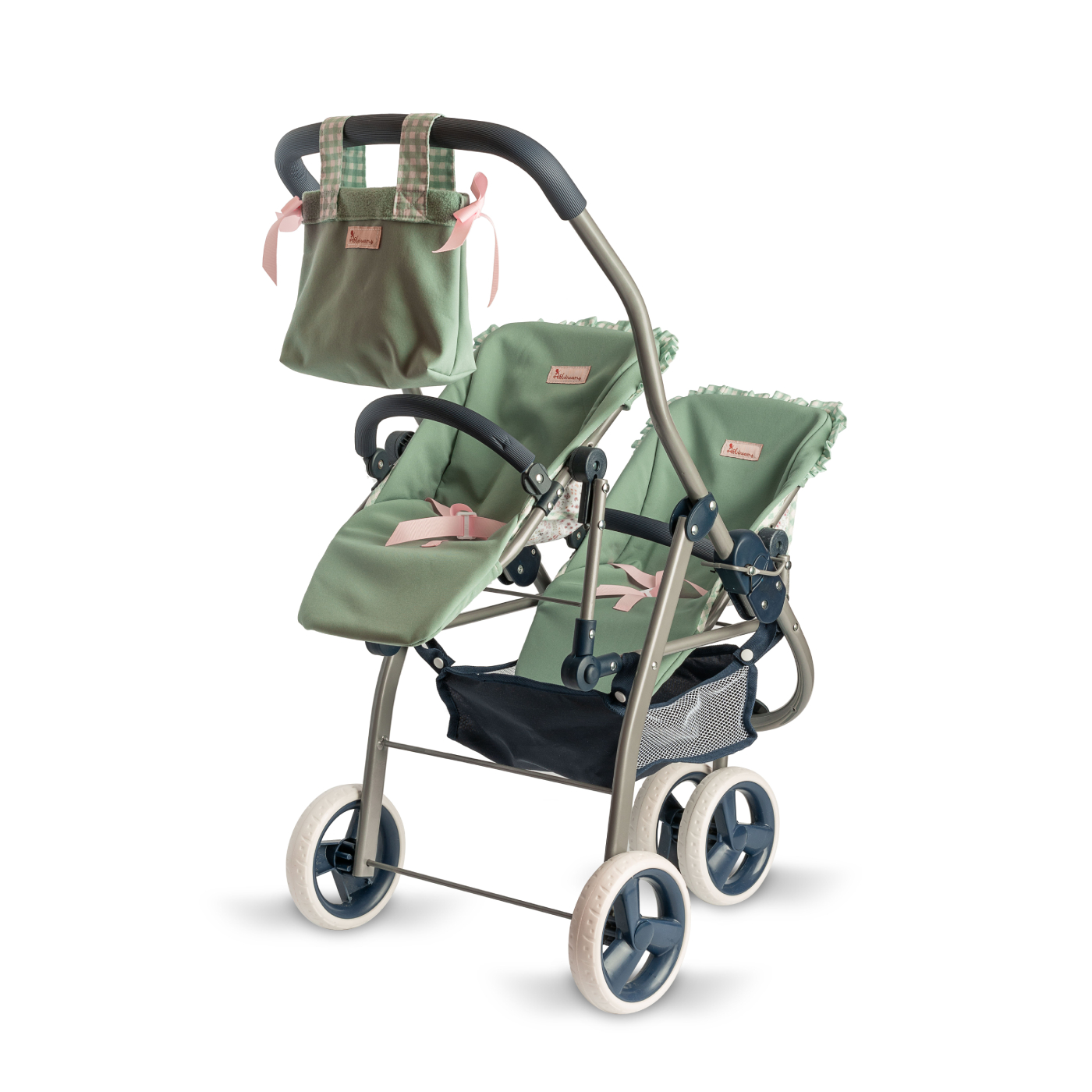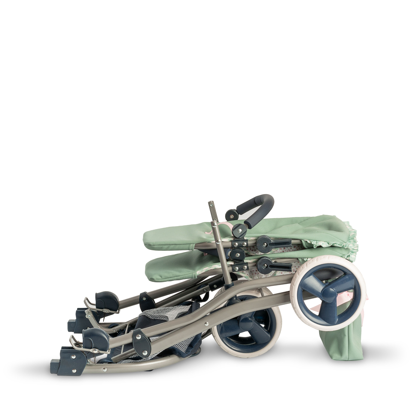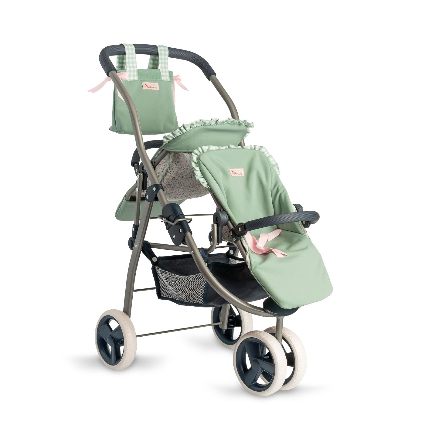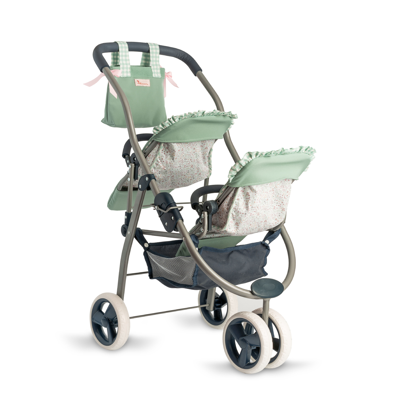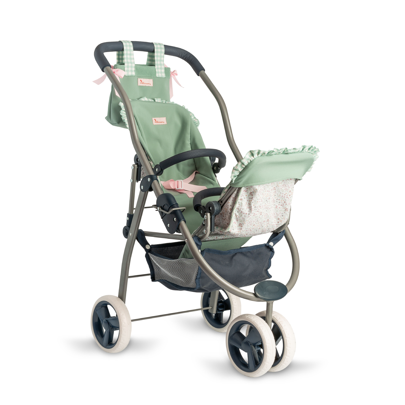 Wnętrze ozdobionych falbankami siedzisk jest wyścielone materiałem w kolorze zielonym, na zewnątrz - przyciąga wzrok bawełniana tkanina w uroczą łączkę, charakterystyczna dla bestsellerowej kolekcji akcesoriów Cloe. Pasy bezpieczeństwa umożliwiają proste przymocowanie lalek.