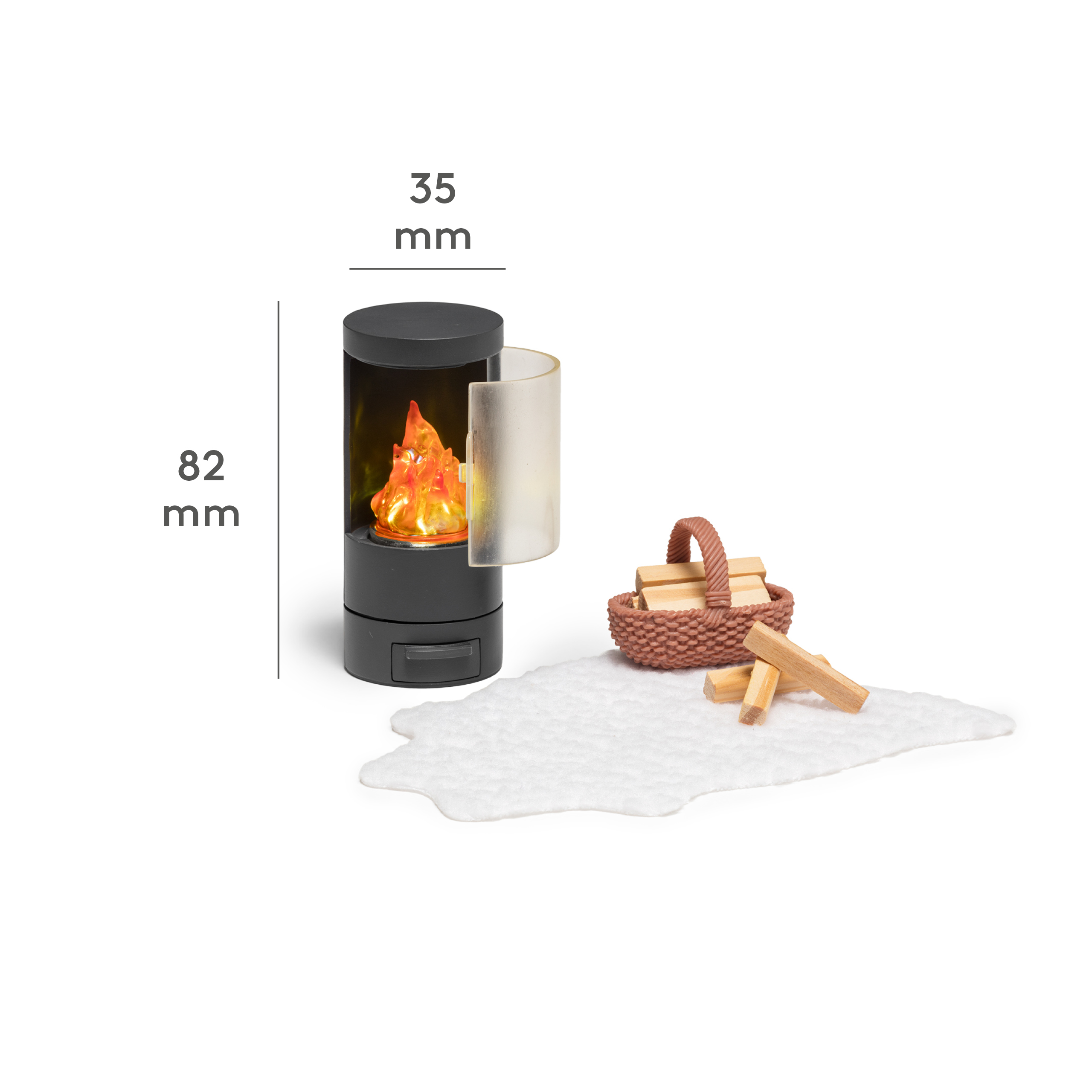 Zawiera piękny czarny kominek, który ma otwierane drzwiczki i popielnik, a wewnątrz jest ogień z prawdziwym oświetleniem LED z wbudowanym timerem; dywanik imitujący owczą skórę oraz koszyczek i 4 klocki drewna opałowego. Oświetlenie włącza się jednym kliknięciem, a po 15 minutach wyłączy się automatycznie.