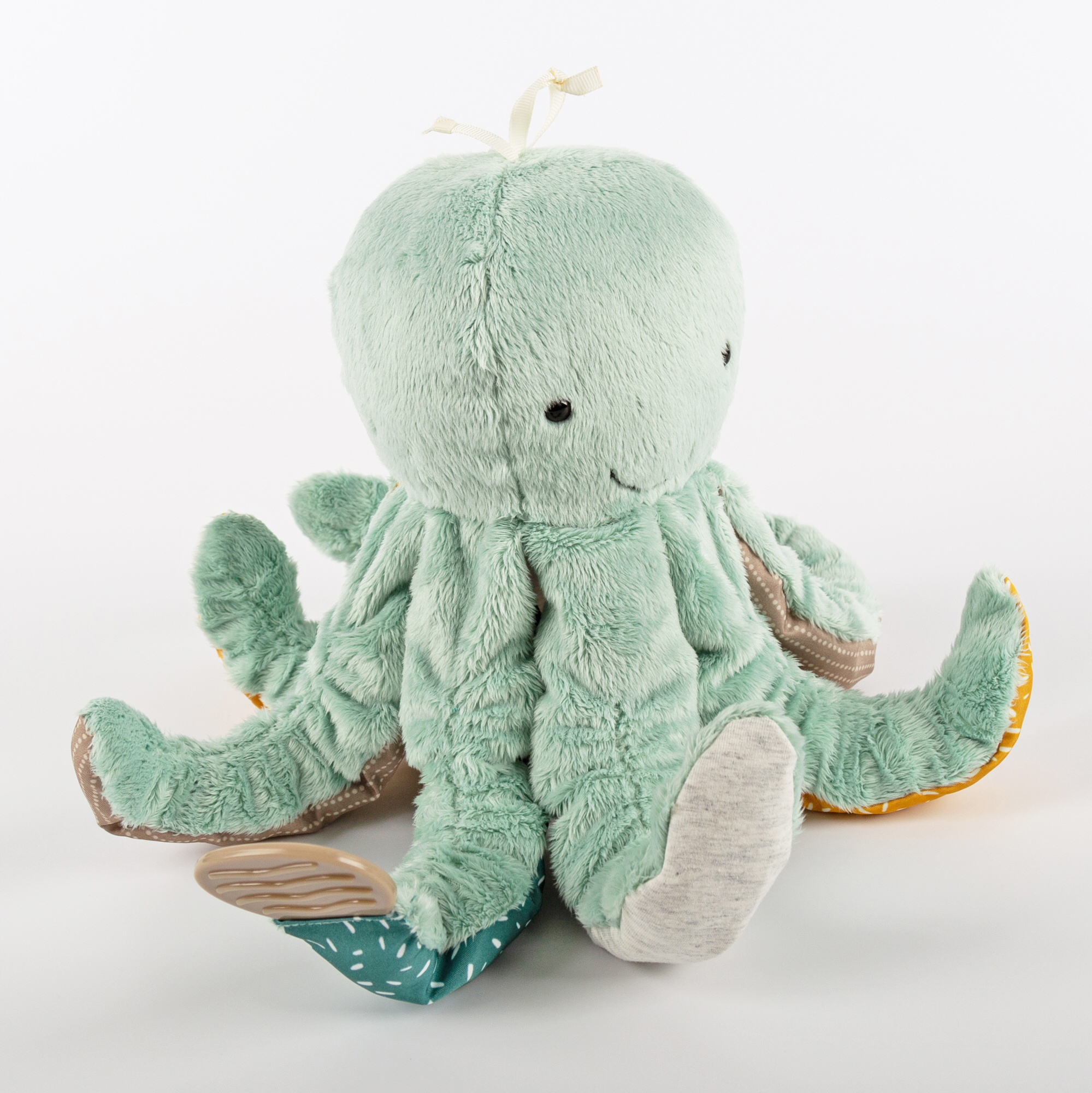 Ta rozwojowa zabawka zapobiega nudzie i zachęca dzieci do aktywnego chwytania, czucia, słuchania i odkrywania związku przyczynowo-skutkowego. Ośmiornica zaprasza do eksplorowania, jest łatwa do uchwycenia i trzymania przez małe rączki. Maskotka jest również doskonałą pierwszą przytulanką.