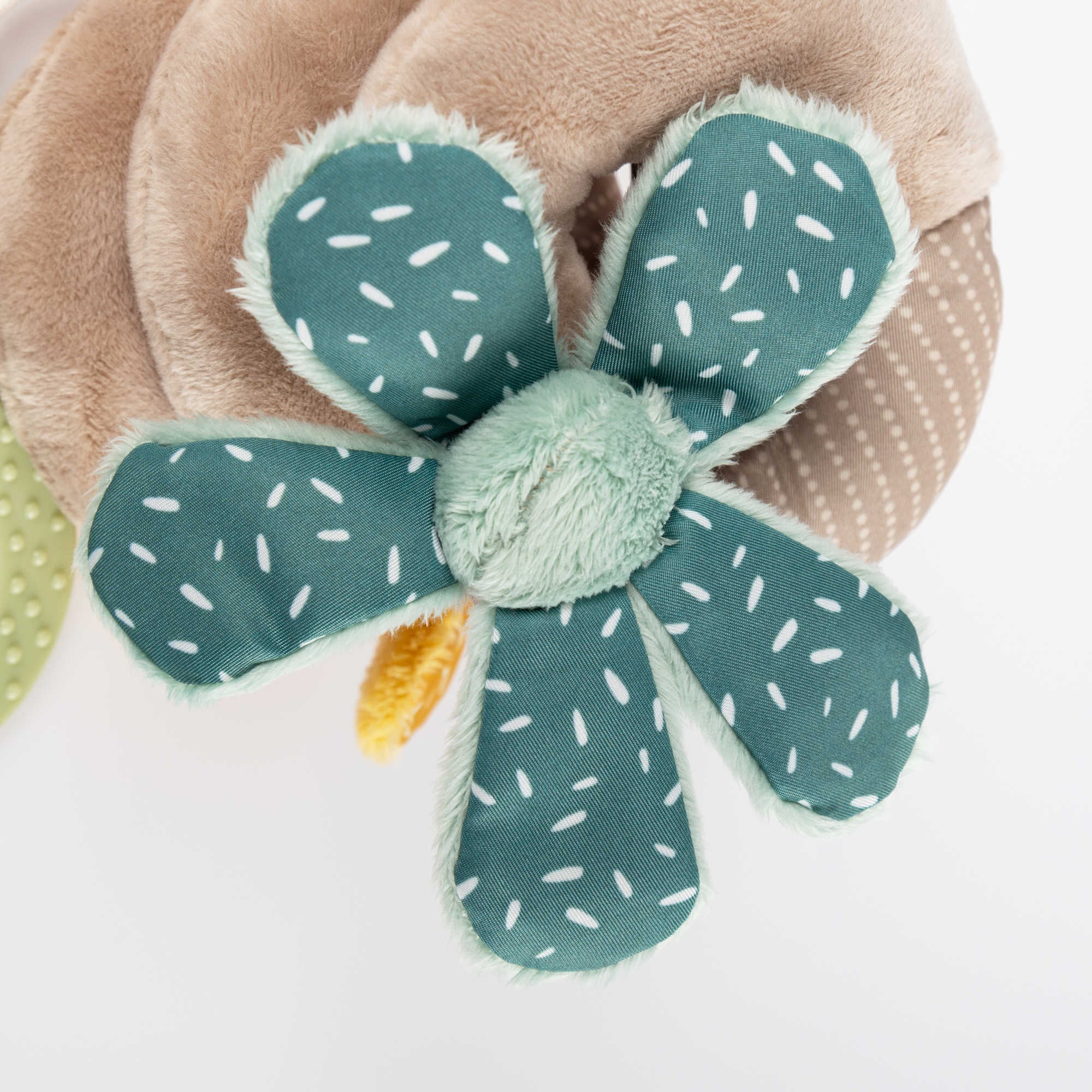 Ta urocza zabawka rozwojowa ma dwa kolorowe kwiaty na końcach oraz dwa motyle - jeden z bezpiecznym lusterkiem doczepianym na rzep, dzięki któremu Twoje maleństwo może odkrywać siebie, a drugi z gryzakiem, który przyniesie ulgę w ząbkowaniu.
