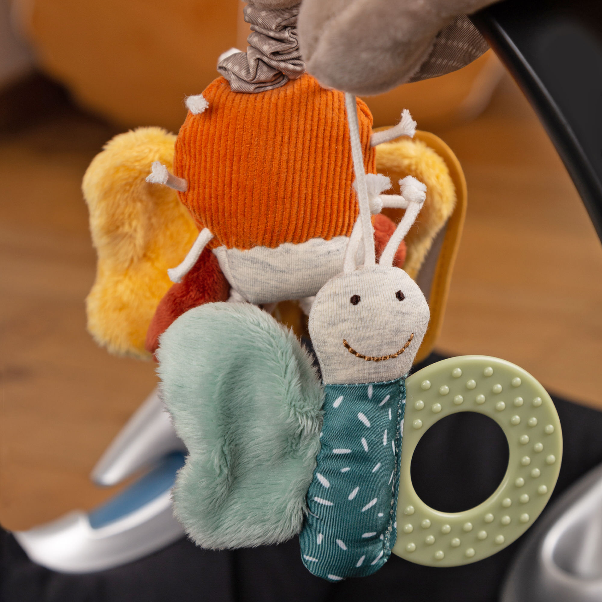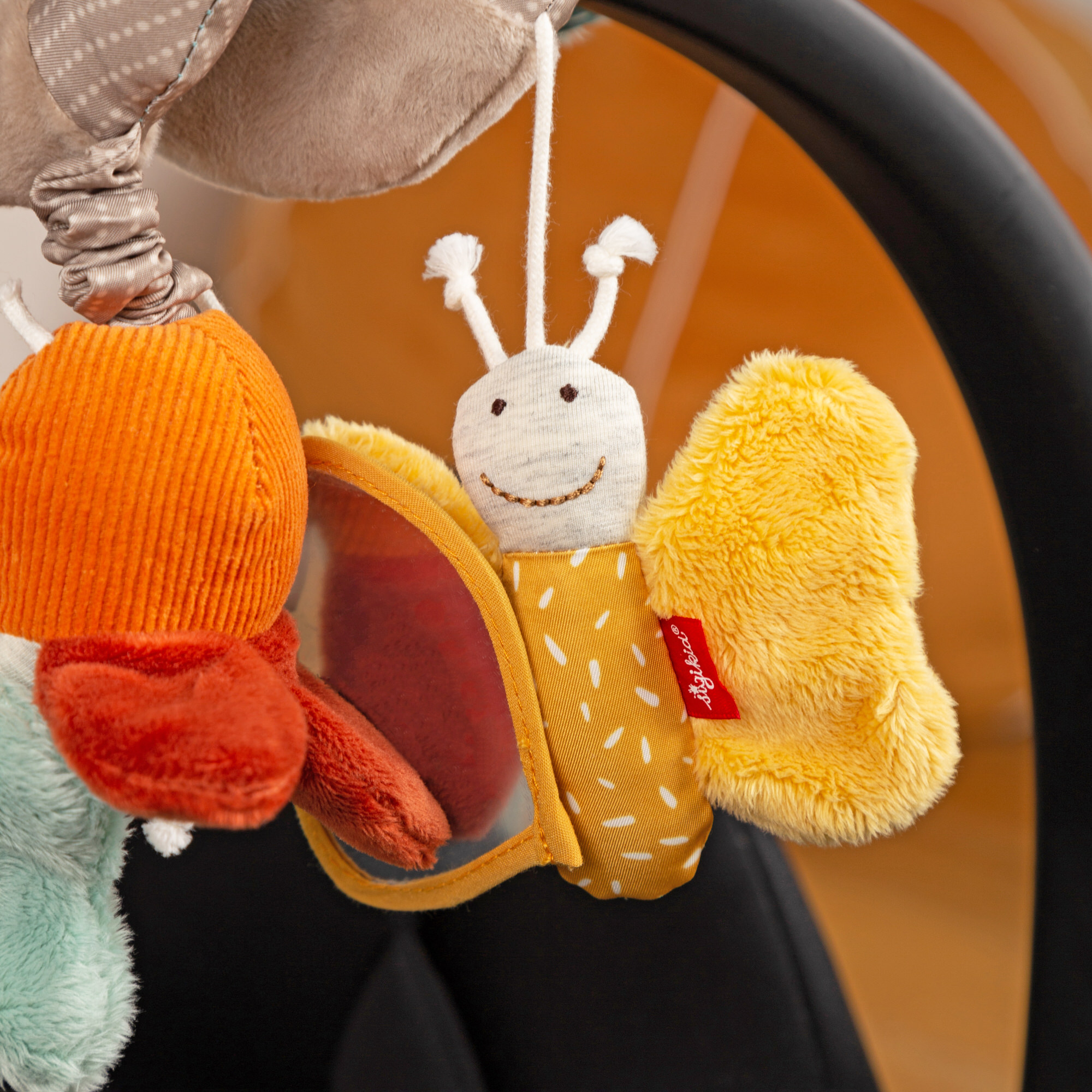 Praktyczny kształt tej zabawki rozwojowej sprawia, że można ją szybko i łatwo owinąć wokół rączki wózka, nosidełka lub szczebelków łóżeczka. Ma dwa kolorowe kwiaty na końcach oraz dwa motyle - jeden z bezpiecznym lusterkiem, dzięki któremu Twoje maleństwo może odkrywać siebie, a drugi z gryzakiem, który przyniesie ulgę w ząbkowaniu. Czerwony radosny chrząszcz jest przymocowany do wibrującej grzechotki. Gdy dziecko za niego pociągnie, chrząszcz powraca do pozycji wyjściowej, wydając zabawny dźwięk „RRRR”. Jaka frajda!