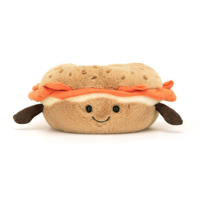 Zabawny Bajgiel marki JellyCat to bardzo miły i przyjemny w dotyku pluszak. To urocza przekąska o uśmiechniętej buźce w kształcie mięciutką bułki z zamszowymi plastrami łososia, serkiem śmietankowym oraz sztruksowymi rączkami. Bajgiel został uszyty z najwyższej jakości, trwałych i bezpiecznych dla dzieci materiałów.