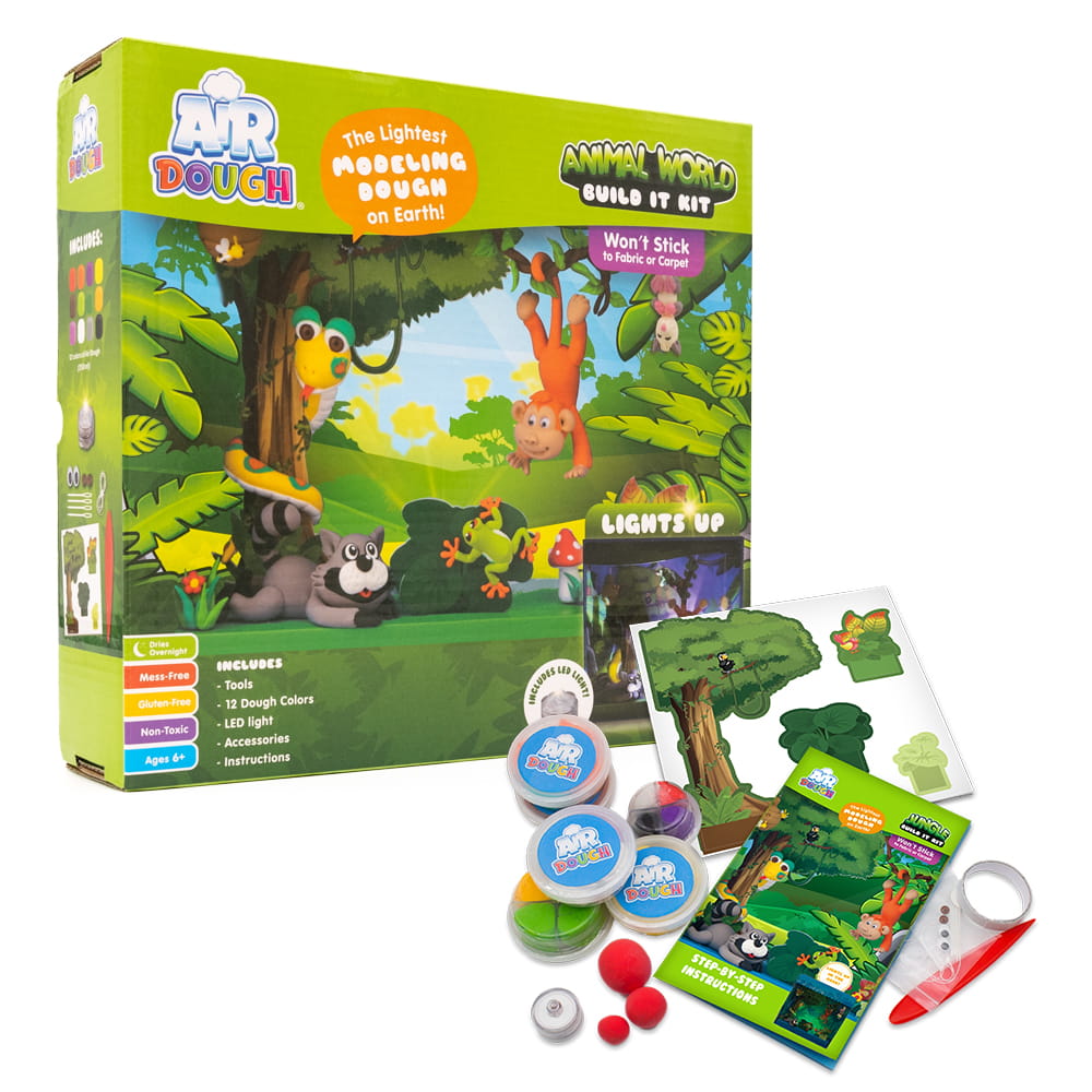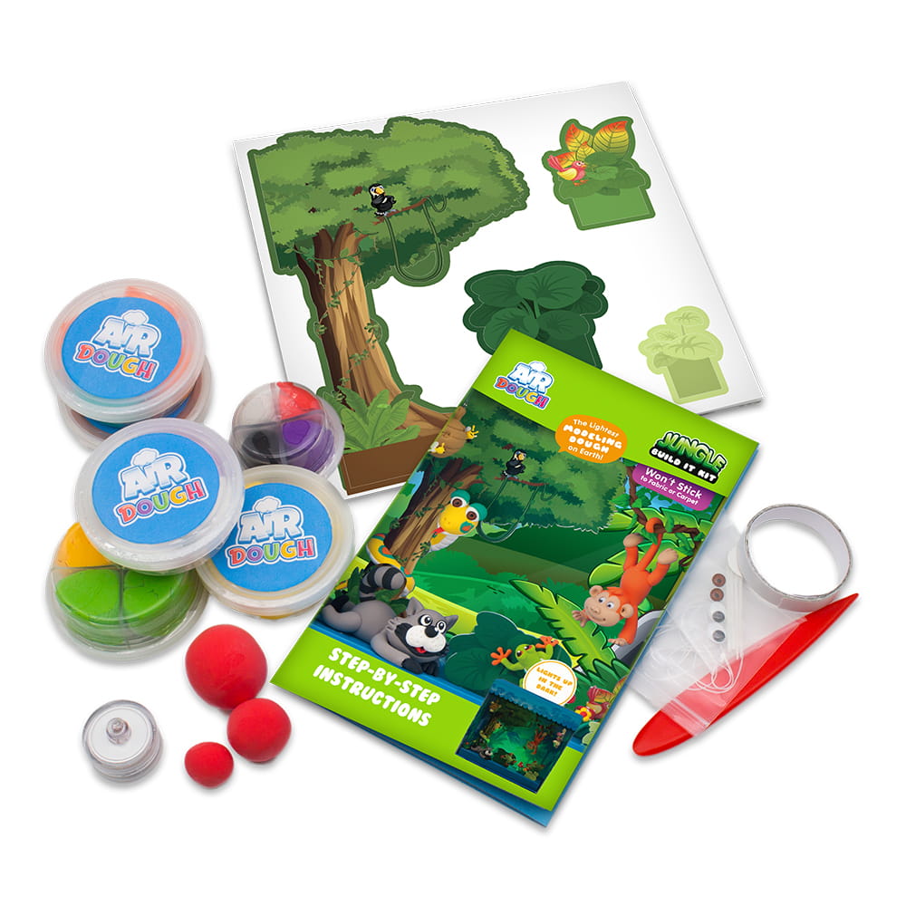 Air Dough to ciastolina lekka jak powietrze! To najlżejsza masa plastyczna dostępna na rynku. Z zestawem Zbuduj dżunglę stworzysz samodzielnie makietę dzikiej dżungli, którą dla lepszego efektu można podświetlić, by stała się atrakcyjnym elementem dekoracyjnym!