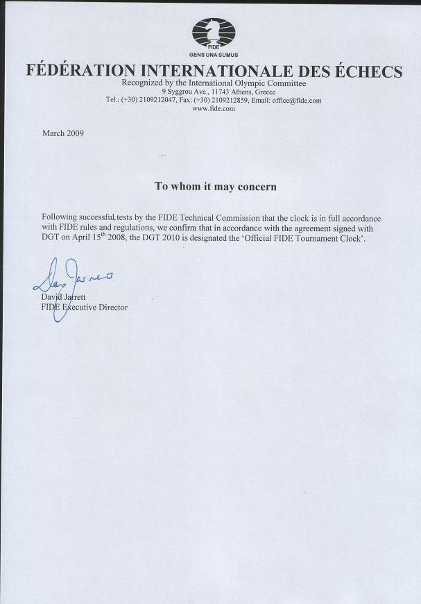 Zegar DGT 2010 jest obok zegara DGT 3000 DGT 3000 jednym oficjalnym zegarem szachowym Międzynarodowej Federacji Szachowej (FIDE), co poświadczono certyfikatem wystawionym przez tę organizację (atest FIDE). Jest to jeden z najlepszych profesjonalnych elektronicznych zegarów szachowych, jakie są aktualnie dostępne na rynku. Najnowsza wersja dostępna w naszym sklepie posiada 36 ustawień tempa gry.