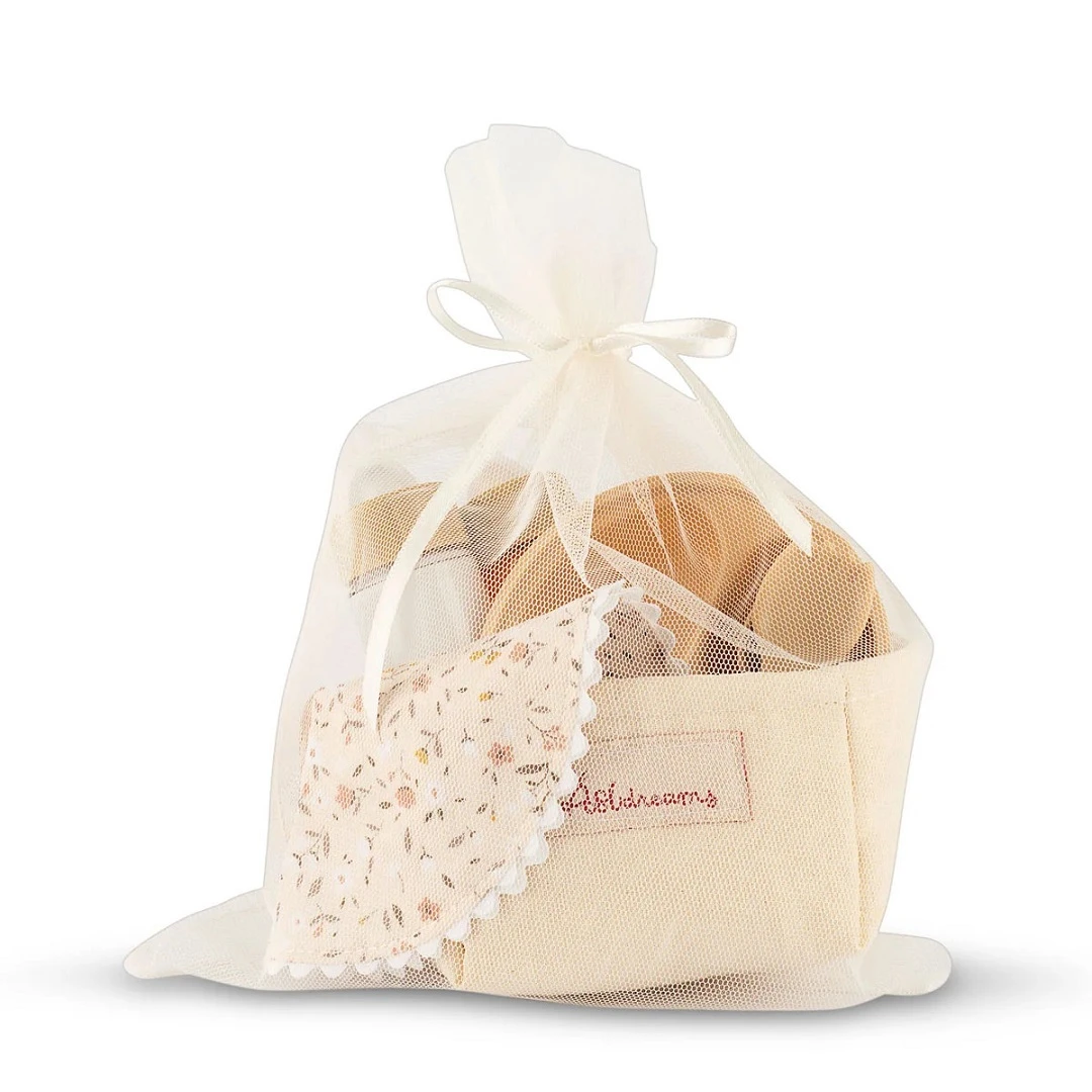 "mlekiem". Wszystko znajduje się w materiałowym jasnobeżowym koszyczku, który z