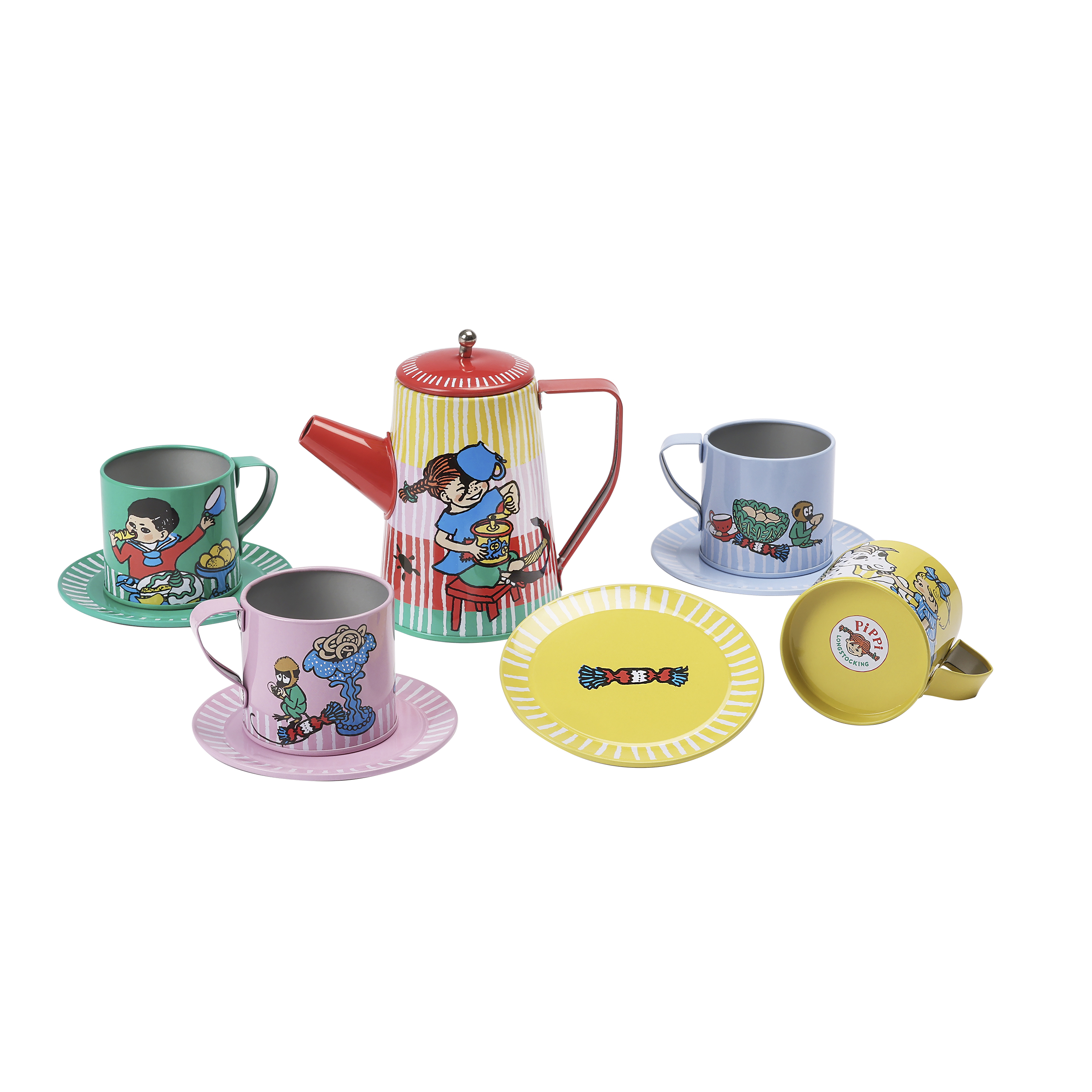 Uroczy zestaw do herbatki Pippi ma kolorowe ilustracje prosto z książek Astrid Lindgren. Komplet naczyń zawiera: 4 kubki, 4 talerzyki i dzbanek z pokrywką. Ten komplet został zaprojektowany w Szwecji i wykonany z trwałego, a jednocześnie lekkiego metalu na podstawie oryginalnych ilustracji z książek o perypetiach Pippi Langstrumpf.