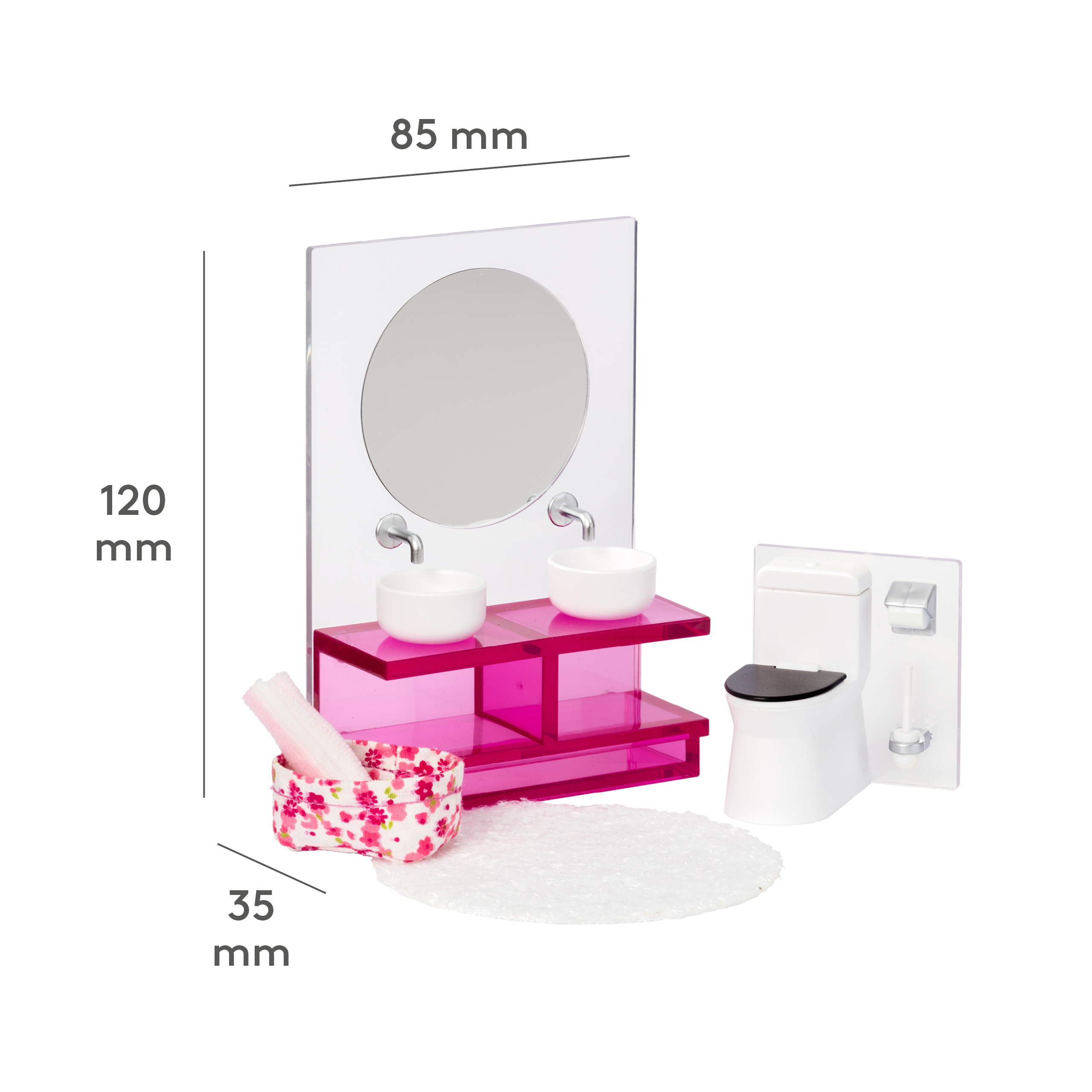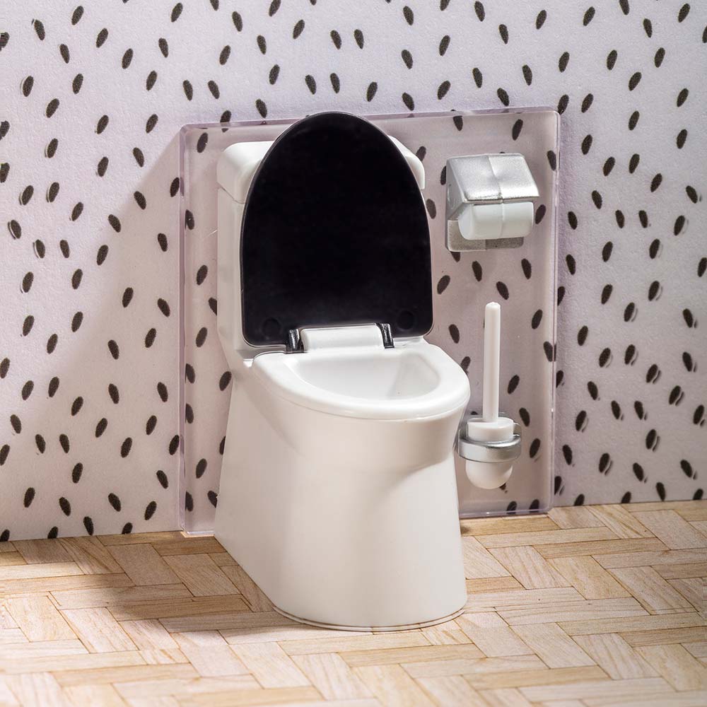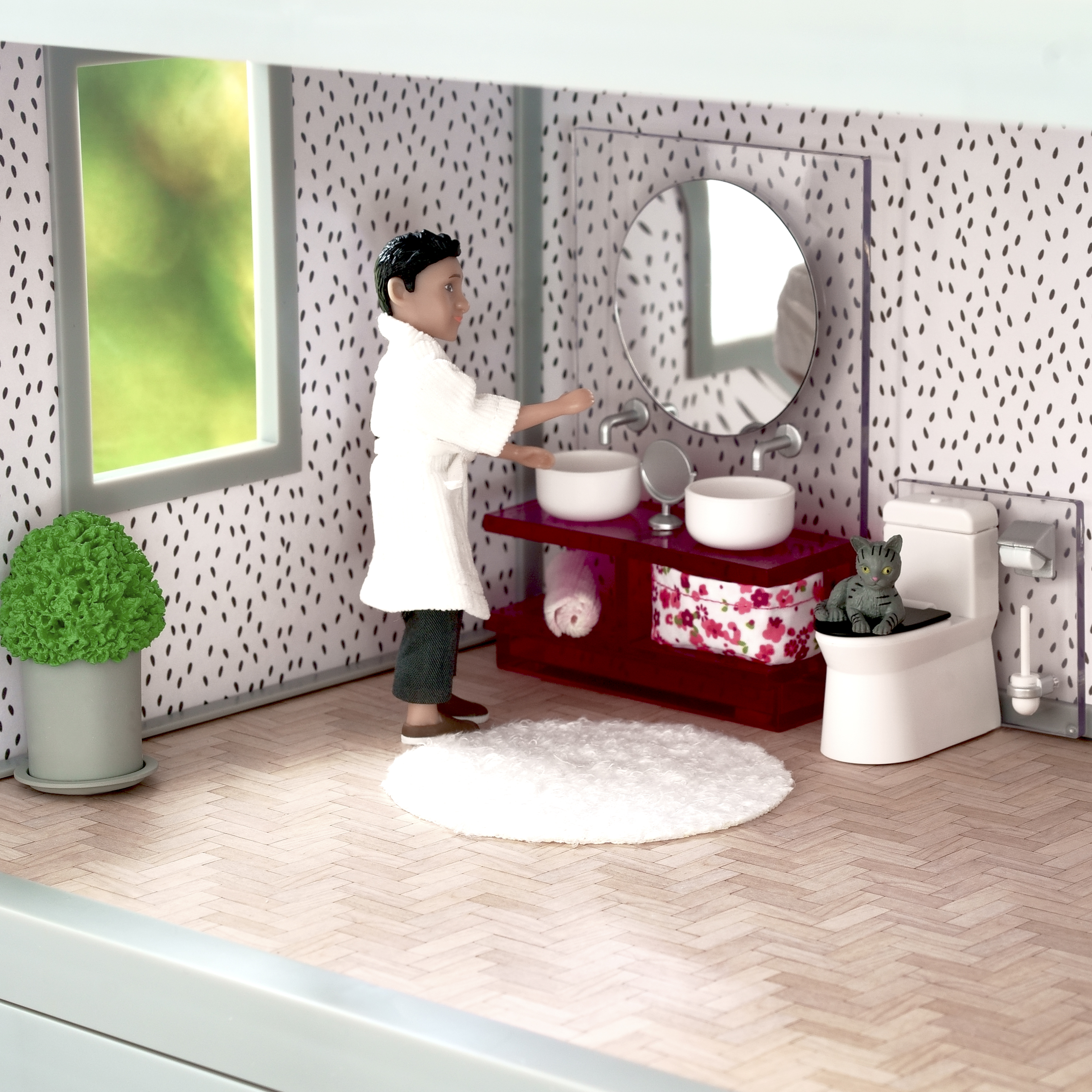 Stylowy i nowoczesny zestaw mebli i akcesoriów łazienkowych to obowiązkowa pozycja wyposażenia łazienki w domku dla lalek. W zestawie znajduje się toaleta z podnoszoną klapą, papierem toaletowym i szczotką do czyszczenia, zabudowa z dwiema umywalkami i półeczkami, okrągłe lustro, ręcznik, koszyczek oraz mięciutki dywanik.