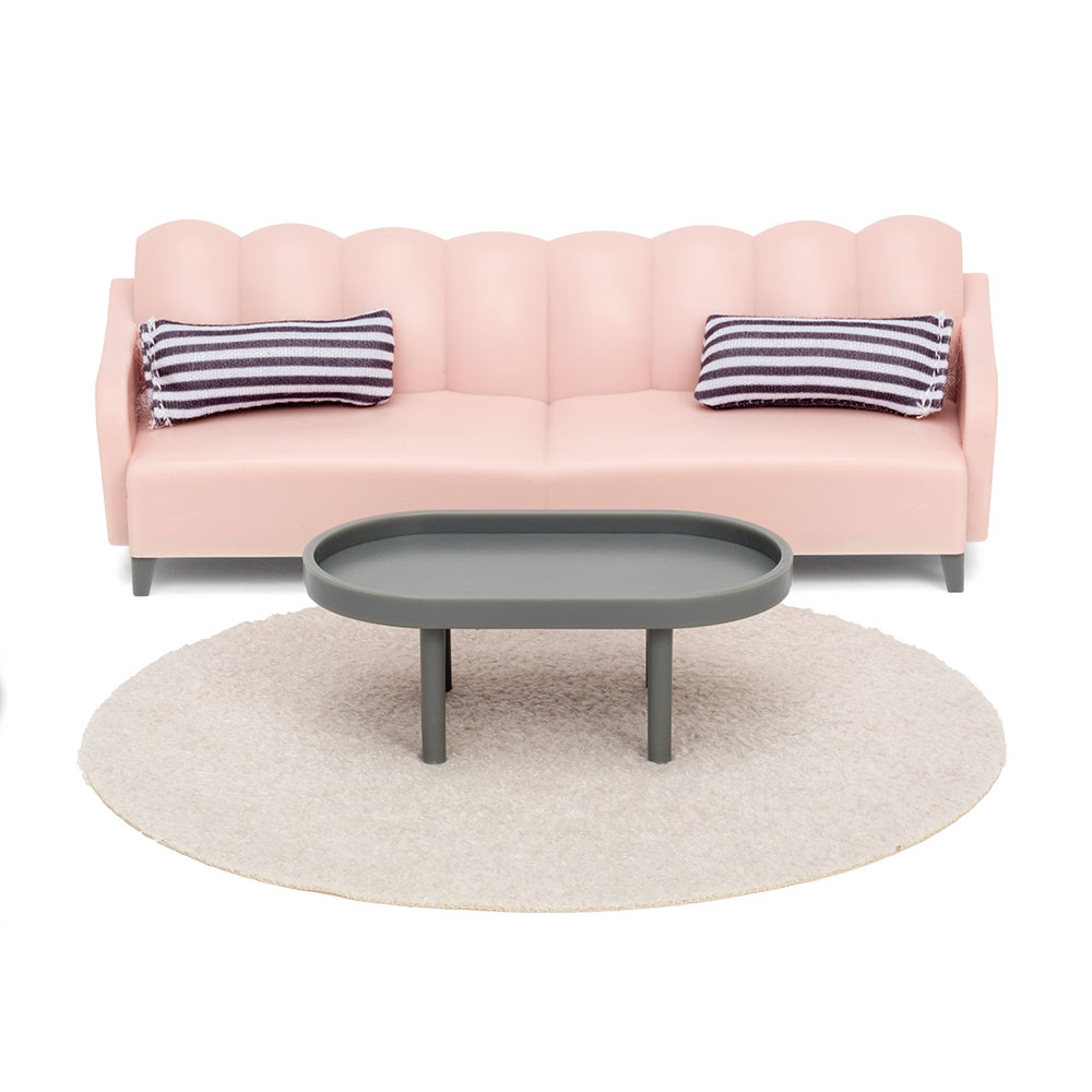 Szybko i łatwo urządź swój salon w domku dla lalek marki Lundby dzięki temu stylowemu kompletowi mebli. Zestaw obejmuje różową sofę, dwie pasiaste poduszki, miękki beżowy dywan i szary stolik kawowy. Prosty skandynawski styl z nutą słodyczy!