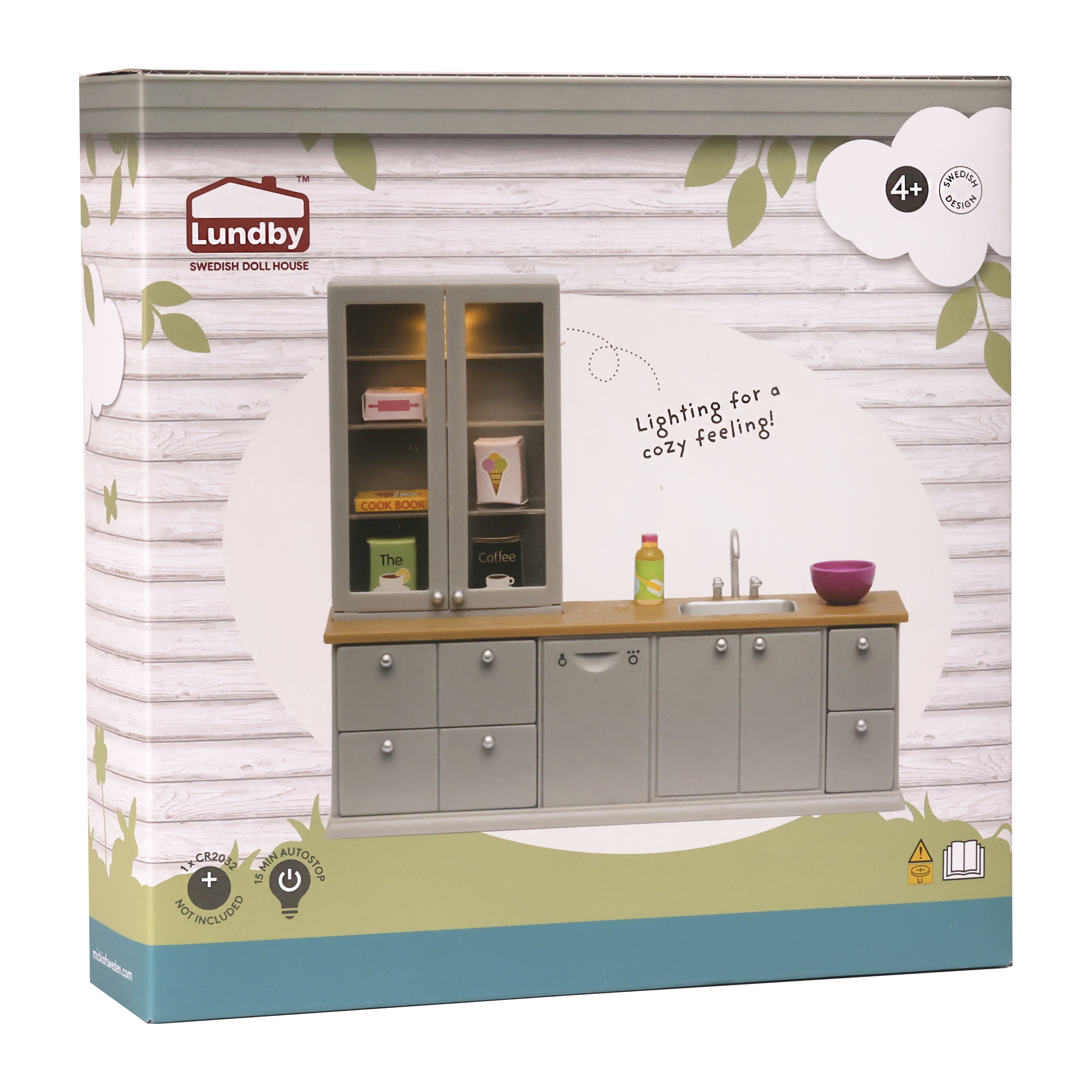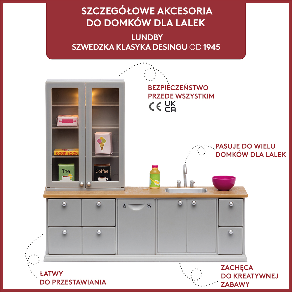 Ten luksusowy zestaw mebli kuchennych zachwyci wszystkich małych mieszkańców domku dla lalek Lundby. W komplecie znajduje się obszerna zabudowa kuchenna ze zlewem, szufladami, szafką i zmywarką oraz kredens z półkami i prawdziwym oświetleniem LED, które zawiera wbudowany timer. W zestawie znajdziesz również płyn do mycia naczyń i miseczkę do jeszcze lepszej zabawy.
