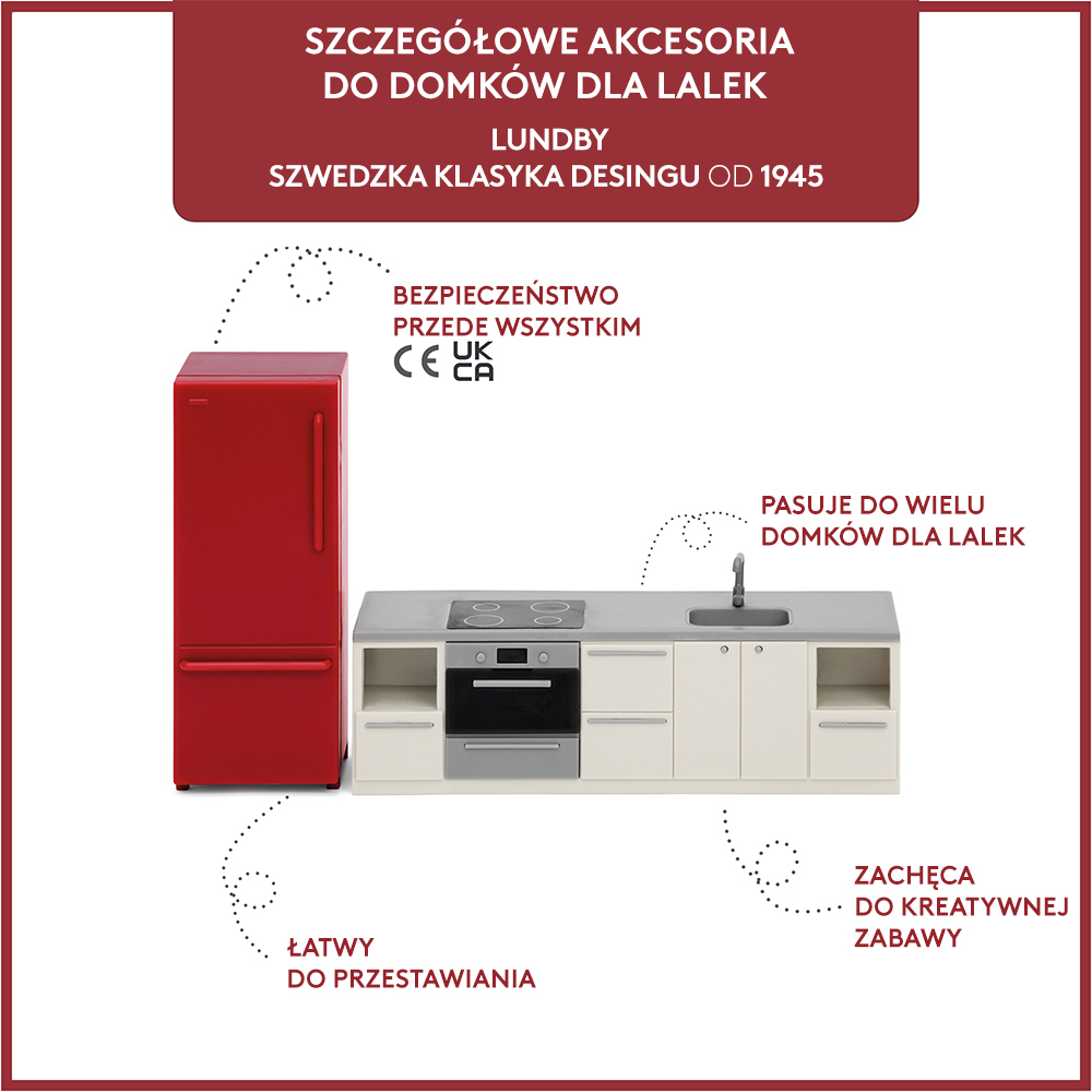 Klasyczny komplet mebli do kuchni zawiera zabudowę szafek kuchennych z blatem, zlewem, piekarnikiem i kuchenką oraz przepiękną wolnostojącą lodówkę w kontrastującym kolorze czerwonym. Szwedzki design sprawia, że pasuje do każdego wystroju domku dla lalek marki Lundby i zapewnia szybkie oraz łatwe urządzenie przestrzeni.