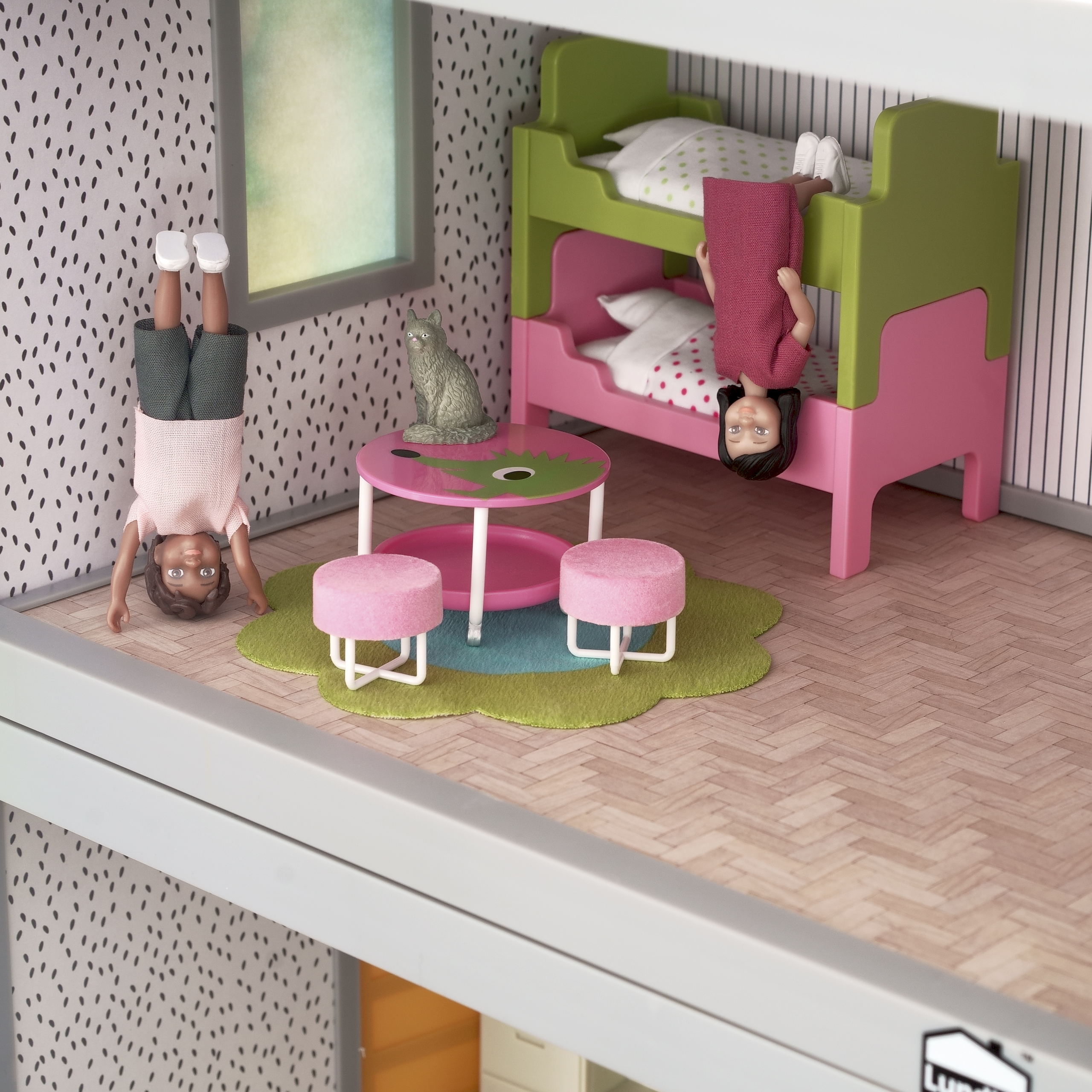 Od teraz dzieci w domku dla lalek nie bedą się nigdy nudzić. Zestaw mebli do pokoju dziecięcego zawiera fantastyczne łóżko piętrowe, które można przekształcić w dwa pojedyncze łóżka, dwa komplety pościeli, okrągły stolik z półką na kółeczkach - idealny do przeróżnych aktywności, dwa wygodne taborety i radosny dywan. Całość w bardzo energetyzujących kolorach pobudzi młodszych mieszkańców domku do wesołej i kreatywnej zabawy!
