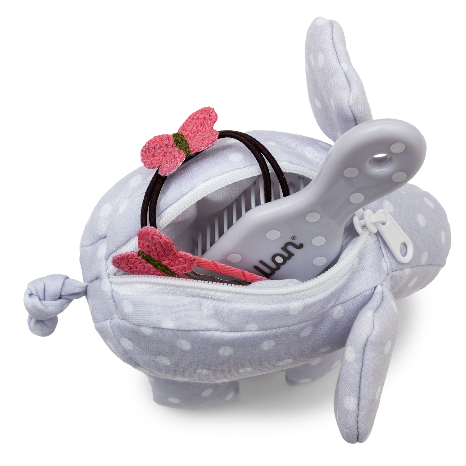Czesz, zaplataj i układaj bajkowe fryzury Twojej lalce! Z pomocą tych uroczych akcesoriów do włosów nie tylko wyczarujesz nowy modny styl, ale też odkryjesz więcej okazji do wspaniałej zabawy. Kosmetyczka to kolejna zabawka - słonik Elli w kropeczki, który zawiera miękkie gumki i spinki do włosów z motylkami, a także elegancką szczotkę, dzięki której włosy Twojej lalki bedą zawsze gładkie i ułożone zgodnie z najnowszymi trendami.