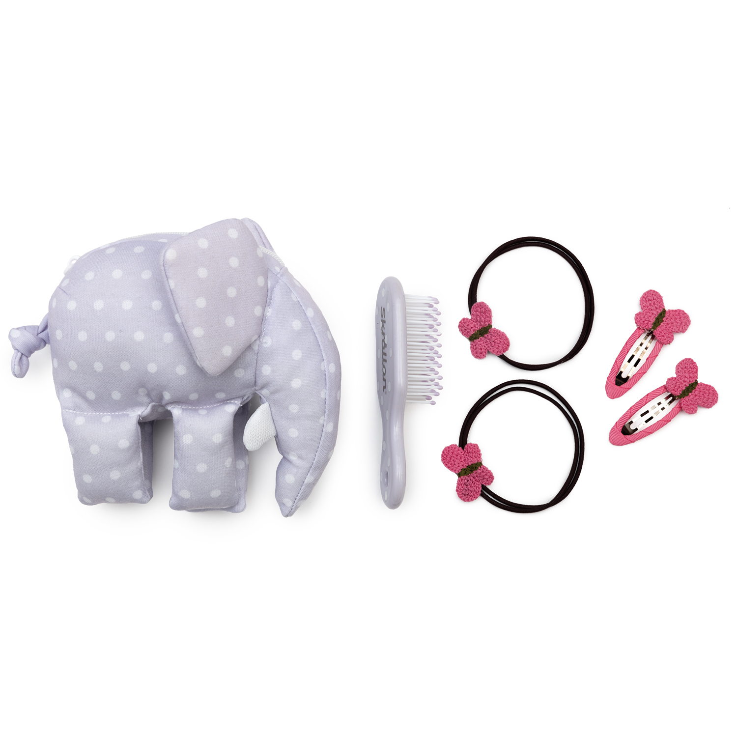 Wszystko mieści się w uroczej małej kosmetyczce w kształcie słonia o imieniu Elli. Elli uwielbia nosić ze sobą szczoteczkę, gumki i spinki do włosów Skrållan. Jest także miękki i przyjemna w dotyku, uwielbia być przytulany i bawić się!