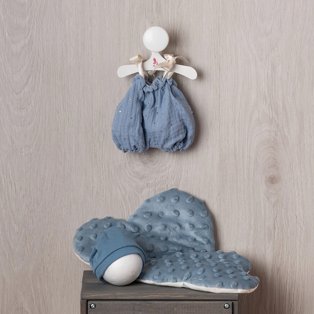 Ręcznie szyty, miękki, muślinowy niebieski rampers z satynowymi wiązanymi ramiączkami został zaprojektowany specjalnie dla lalek hiszpańskich z serii ASI Gordi. Strój dopełnia ciepła czapeczka oraz pikowany kocyk w kształcie chmurki. Wygodne zapięcie na rzep umożliwia łatwe zdjęcie i nałożenie ubranka.