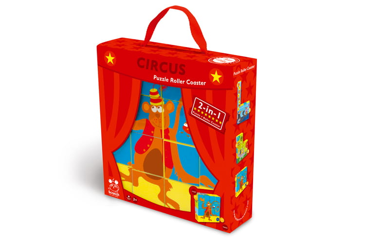 Zestaw składa się z 2 kul i 16 kostek sześciennych, z których 3 mają specjalnie rozmieszczone otwory. Zadaniem dziecka jest takie ułożenie puzzli, by powstał odpowiedni obrazek i przy okazji tor dla kulek. Tylko prawidłowe ułożenie klocków umożliwi kulkom przetoczenie się przez całą budowlę z góry na dół. Z zestawu można ułożyć 3 urocze ilustracje ze zwierzątkami cyrkowymi, a także stworzyć tor według własnego pomysłu. Wszystko zależy od wyobraźni i kreatywności dziecka.