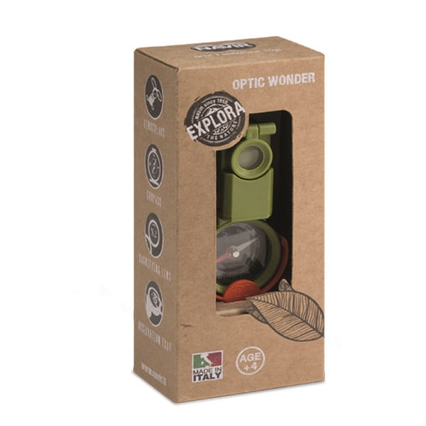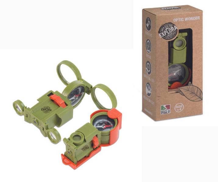 Doskonały przyrząd optyczny niezbędny każdemu małemu podróżnikowi. Pomoże znaleźć właściwą drogę dzięki wbudowanemu kompasowi. Może służyć także jako lornetka aby odnaleźć punkty orientacyjne w terenie lub podglądać oddalone od nas zwierzaki i podziwiać ciekawe zjawiska przyrodnicze. Przyda się też jako lupa aby dokładniej zbadać szczegóły znaleziska.