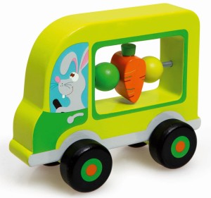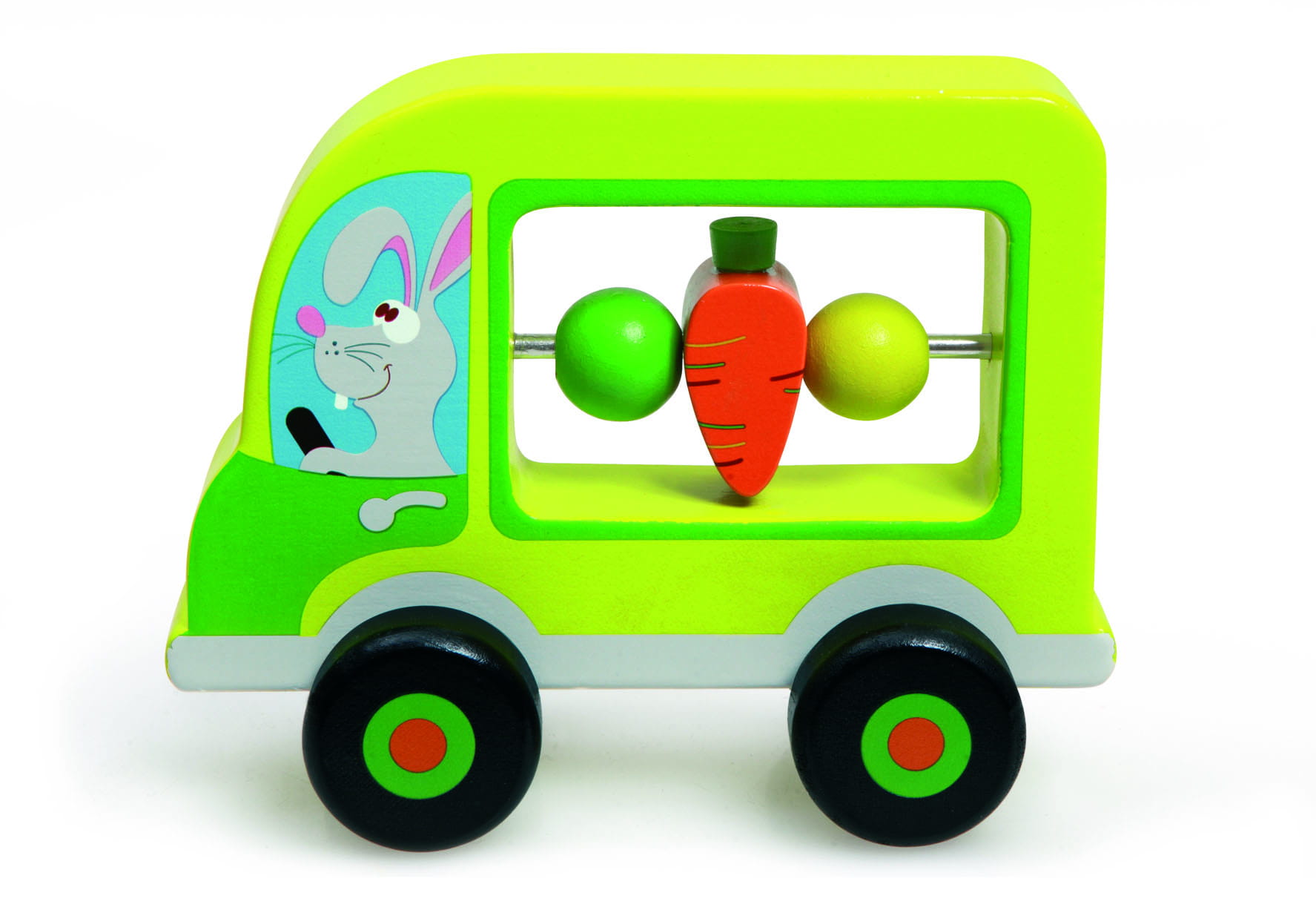 Króliczek przewozi marchewki i kuleczki, które można obracać - wspaniała stymulacja dla malutkich rączek.