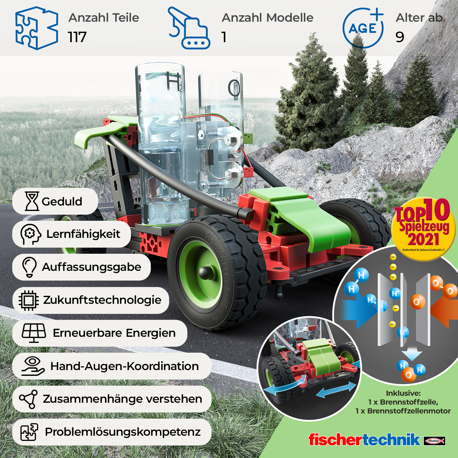 Zestaw klocków konstrukcyjnych pojazd z napędem wodorowym Profi Fischertechnik zawiera 117 elementów, dzięki którym przybliżysz dzieciom pojęcia odnawialnych źródeł energii. Czy to woda, wiatr czy słońce - energia odnawialna to nasza przyszłość. Dzięki ciekawym modelom, dzieci zobaczą, jak to w praktyce działa.